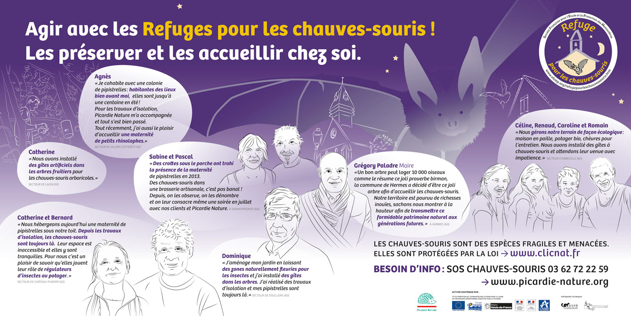 Réalisation d'une bache avec les portraits et témoignages de personnes accueillant des chauves-souris.
